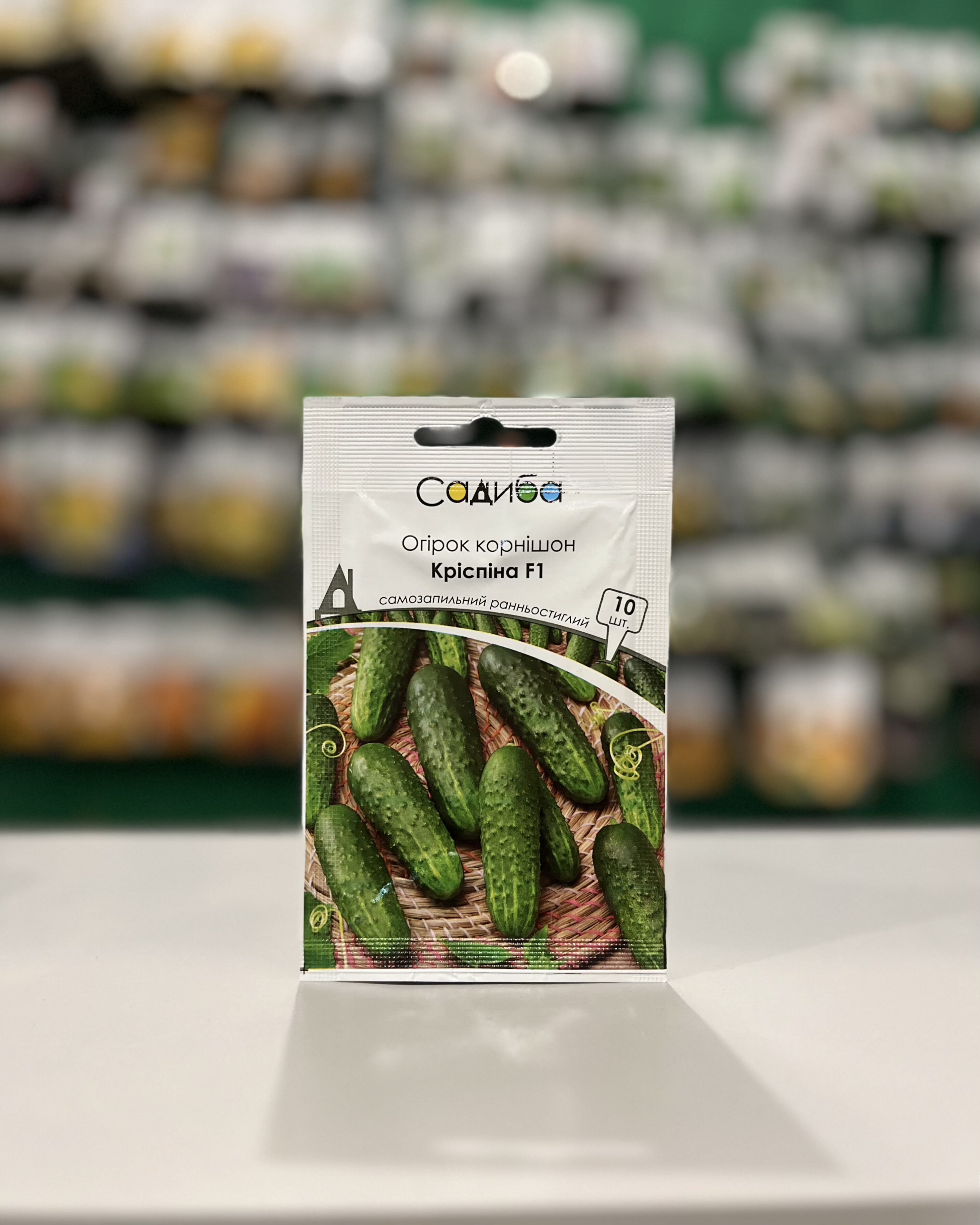 Огірок Кріспіна F1 – ранньостиглий (38-40 днів) високоврожайний самозапильний гібрид корнішонного типу, рекомендований для вирощування у відкритому й закритому ґрунті. Міцна рослина формує в одному вузлі по декілька плодів довжиною 10-12 см, середньою вагою 80-110 г. Однорідні циліндричні зеленці темно-зеленого кольору з крупними бугорками й білими шипами несхильні до жовтіння. М’якуш ніжний, із малою кількістю насіння. Врожайність приблизно 10 кг/м2. Вражає високою продуктивністю й гарною лежкістю. Стійкий до посухи, справжньої й несправжньої борошнистої роси та огіркової мозаїки. Ідеальний гібрид для збирання на пікулі, зберігає чудовий смак при засолюванні й консервації.